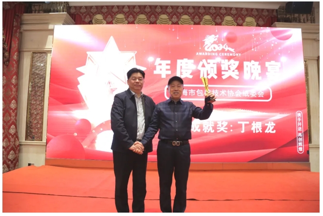憑借過(guò)硬的產(chǎn)品品質(zhì)、齊全的解決方案和優(yōu)秀的服務(wù)能力,上海鼎龍機械有限公司持續引領(lǐng)紙箱機械發(fā)展,在業(yè)內享受盛譽(yù)。年會(huì )晚宴上,上海包協(xié)紙委會(huì )為上海鼎龍機械有限公司創(chuàng )始人及董事長(cháng)丁根龍先生頒發(fā)“終身成就獎”,以表彰其數十年對行業(yè)的卓越貢獻。